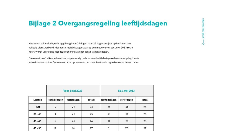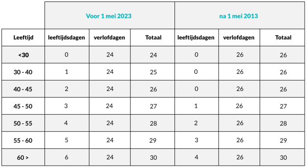 Het aantal vakantiedagen is opgehoogd van 24 dagen naar 26 dagen per jaar op basis van een volledig dienstverband. Het aantal leeftijdsdagen waarop een medewerker op 1 mei 2013 recht heeft, wordt verrekend met deze ophoging van het aantal vakantiedagen.