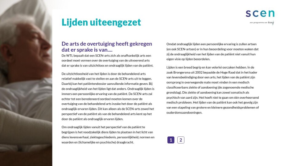 De uitzichtloosheid van het lijden is door de behandelend arts relatief makkelijk vast te stellen en aan de SCEN-arts uit te leggen. Daarbij kan het patiëntendossier aanvullende informatie geven. Bij de ondraaglijkheid van het lijden ligt dat anders. Ondraaglijk lijden is immers een persoonlijke ervaring van de patiënt. De SCEN-arts zal echter tot een beredeneerd oordeel moeten komen over de overtuiging van de behandelend arts inzake het door de patiënt als ondraaglijk ervaren lijden. Dit kan alleen als de SCEN-arts zowel het perspectief van de patiënt als van de behandelend arts kent op het door de patiënt als ondraaglijk ervaren lijden.