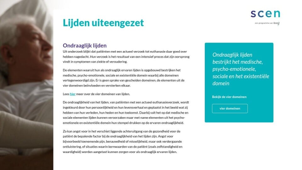 De elementen waaruit hun als ondraaglijk ervaren lijden is opgebouwd bestrijken het medische, psycho-emotionele, sociale en existentiële domein waarbij alle domeinen vertegenwoordigd zijn. Er is geen sprake van gescheiden domeinen, de elementen uit de vier domeinen beïnvloeden en versterken elkaar.