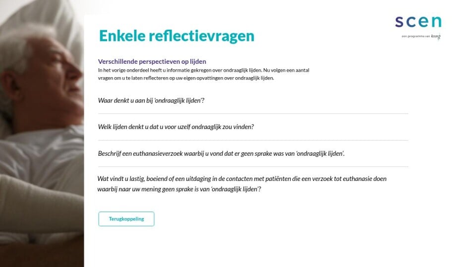 In deze verkenning onderzoekt u hoe en waarom een consultvragend arts tot de conclusie is gekomen dat sprake is van ondraaglijk lijden en u vergelijkt dit met het verhaal van de patiënt. Op basis hiervan komt u tot uw oordeel. Een dergelijk oordeel vereist abstractie en een afstand nemen van uw eigen opvattingen over ondraaglijk of uitzichtloos lijden. Het gaat er dus nadrukkelijk niet om of u vindt dat de patiënt ondraaglijk lijdt.
