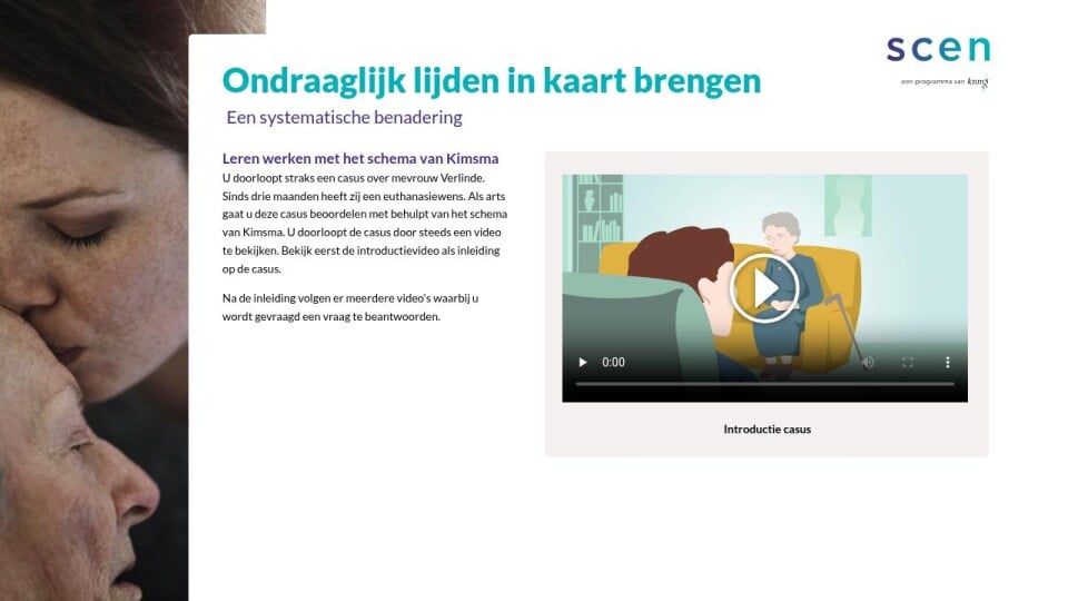 U doorloopt straks een casus over mevrouw Verlinde. Sinds drie maanden heeft zij een euthanasiewens. Als arts gaat u deze casus beoordelen met behulpt van het schema van Kimsma. U doorloopt de casus door steeds een video te bekijken. Bekijk eerst de introductievideo als inleiding op de casus.